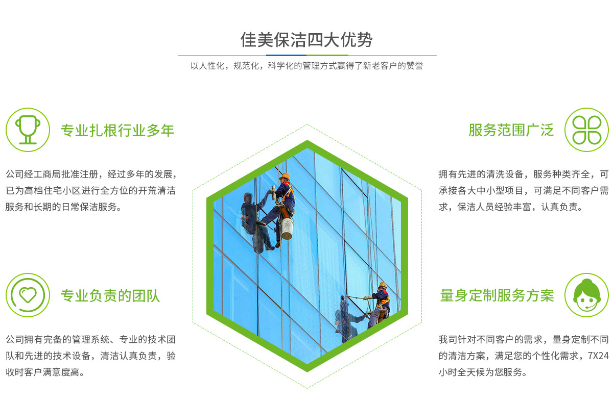 - 馬鞍山市佳美保潔服務(wù)有限公司是一家經(jīng)工商部門批準(zhǔn),具有法人資格專業(yè)清洗,馬鞍山保潔服務(wù)的公司,自創(chuàng)辦以來,一直致力于企業(yè),家庭,賓館,學(xué)校,別墅,酒店,商廈,公共設(shè)施等場所提供科學(xué)的日常保潔和清潔保護(hù)的服務(wù)公司,有著豐富的管理服務(wù)和保潔經(jīng)驗...